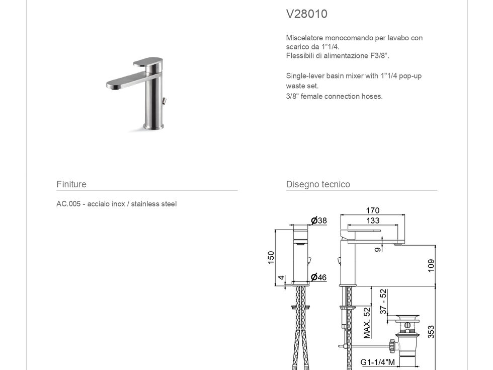 Miscelatore monocomando per lavabo con scarico da 1”1/4.